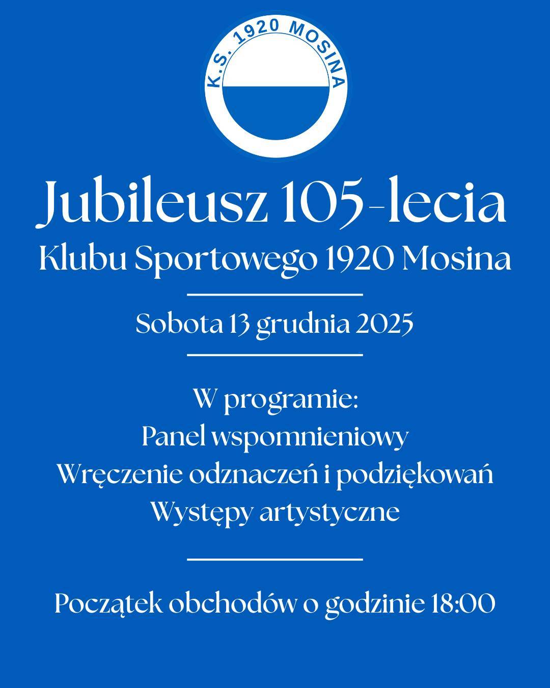 13 grudnia 2025 roku o godzinie 18:00 w Mosińskim Ośrodku Kultury przy ul. Dworcowej 4, odbędą się obchody 105-lecia Klubu Sportowego 1920 Mosina. W programie obchodów znajdą się: