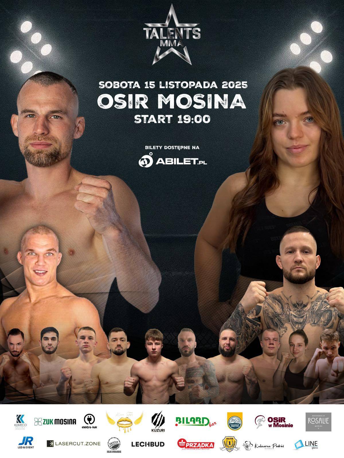 Gala Talents MMA w Ośrodku Sportu i Rekreacji w MosinieOśrodek Sportu i Rekreacji w Mosinie objął patronat nad wyjątkowym wydarzeniem sportowym – galą Talents MMA, która odbędzie się w sobotę, 15 listopada 2025 roku. Start o godzinie 19:00 w hali OSiR Mosina. To wieczór pełen emocji, mocnych pojedynków i sportowych talentów, którzy zaprezentują swoje umiejętności przed publicznością. Bilety są dostępne na abilet.pl. Zapraszamy wszystkich miłośników sportów walki!