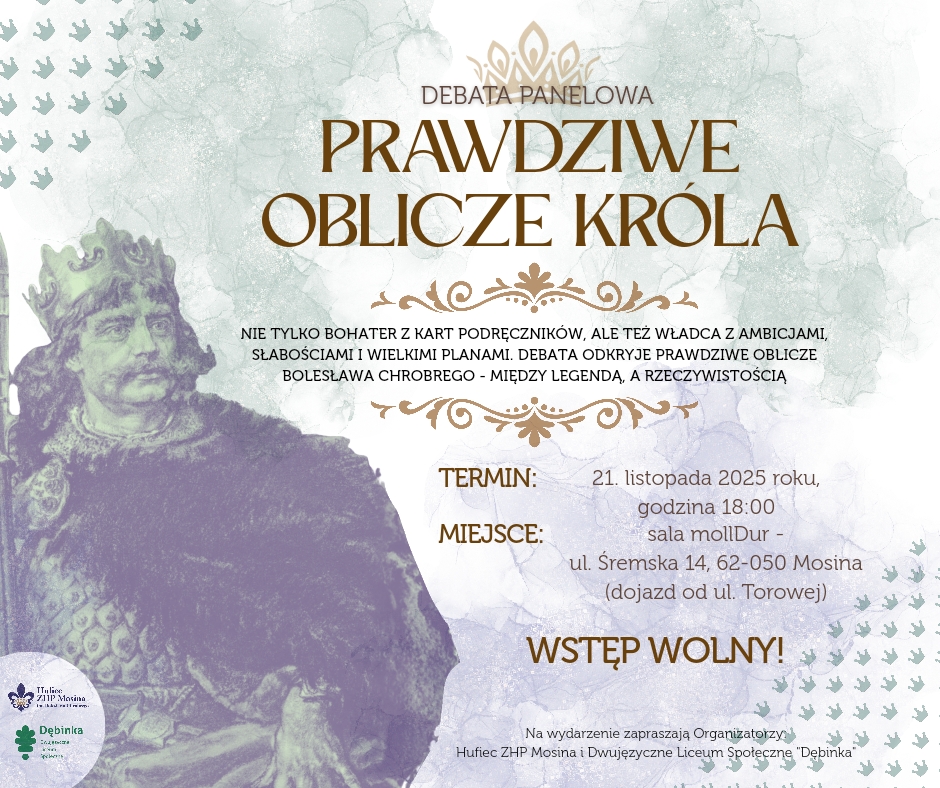 Hufiec ZHP Mosina oraz Dwujęzyczne Liceum Społeczne "Dębinka" zapraszają 21 listopada o godz. 18.00 do sali mollDur w Mosinie przy ul. Śremskiej na wydarzenie "Prawdziwe oblic ...