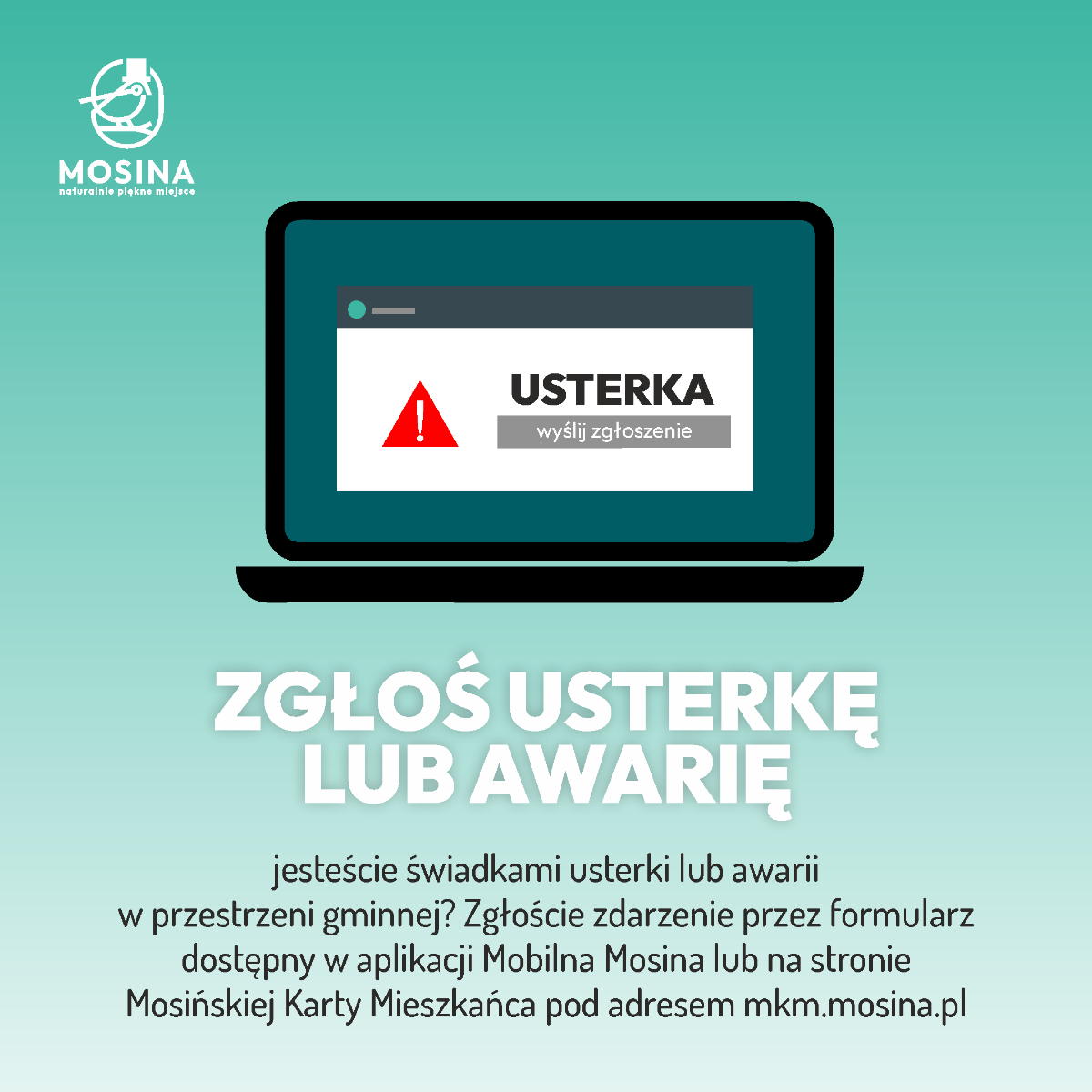 Zależy nam na tym, aby w gminie było bezpiecznie i wygodnie na co dzień. Jeśli zauważycie sytuację wymagającą szybkiej reakcji — awarię, uszkodzenie lub inne zdarzenie — możecie je zgłosić w prosty sposób. Formularz zgłoszeniowy jest dostępny w aplikacji mobilnej Mobilna Mosina oraz na stronie Mosińskiej Karty Mieszkańca