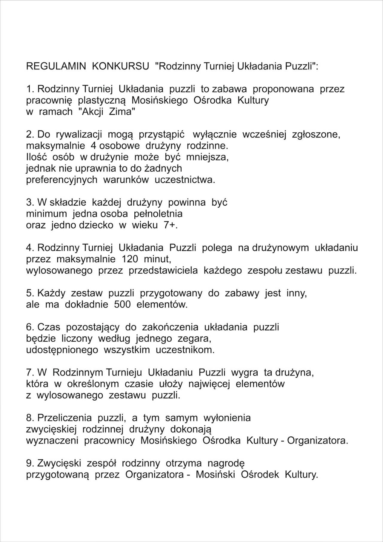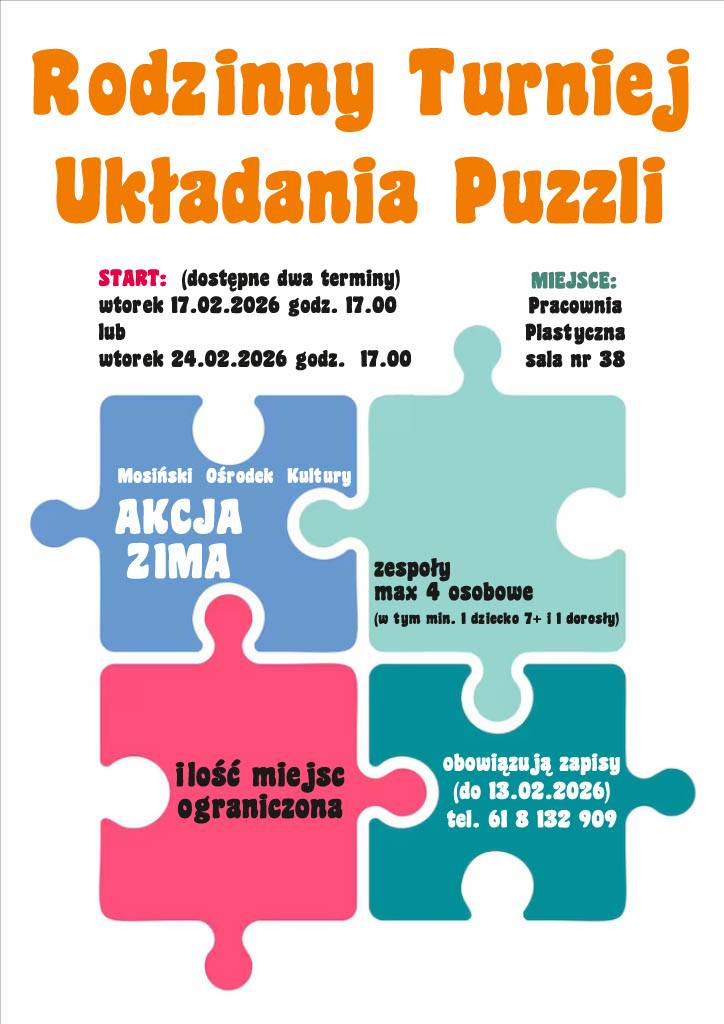 29 stycznia - to Międzynarodowy Dzień Układania Puzzli! Z tej okazji zapraszamy serdecznie na I Rodzinny Turniej Układania Puzzli do Mosińskiego Ośrodka Kultury.