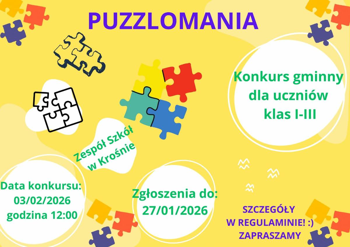 Zapraszamy do udziału w Konkursie Gminnym Puzzlomania, który skierowany jest do uczniów klas 1–3 szkół podstawowych!