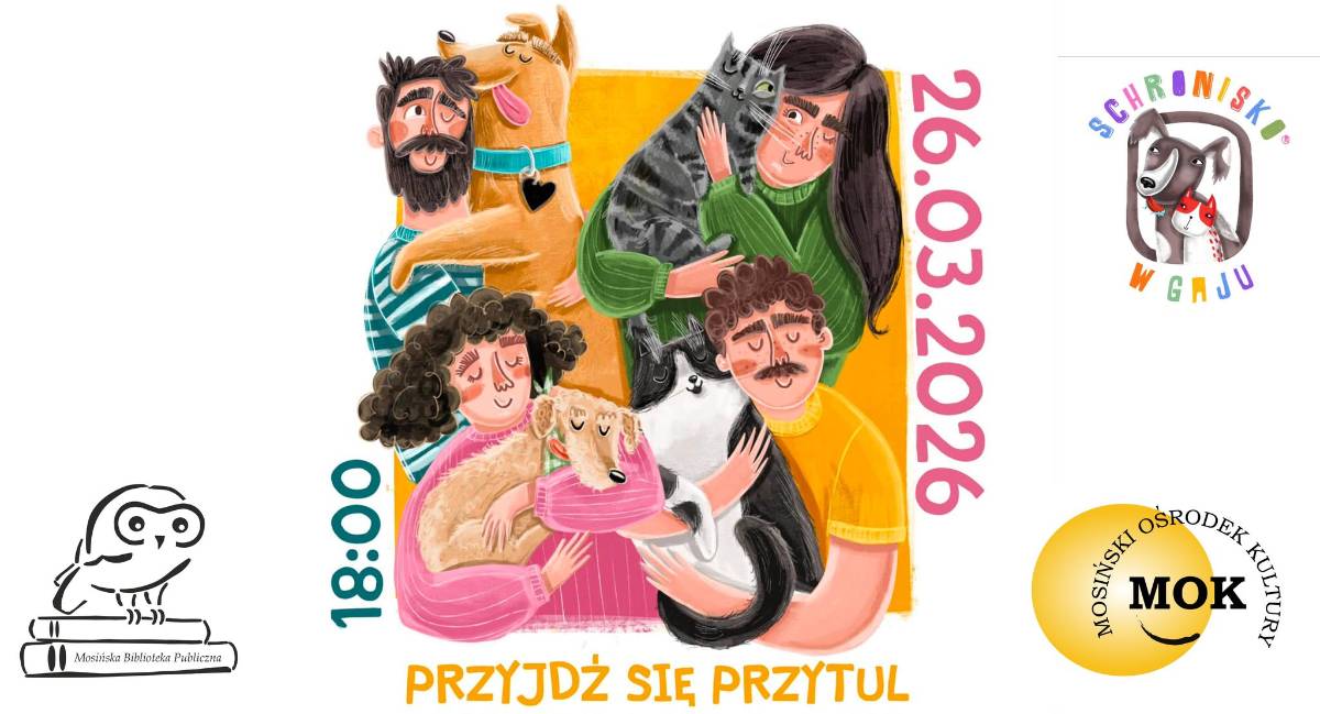 Mosińska Biblioteka Publiczna Mosiński Ośrodek Kultury i Fundacja Schronisko dla zwierząt w Gaju zapraszają na wyjątkowe spotkanie pod hasłem "Przyjdź się przytul".